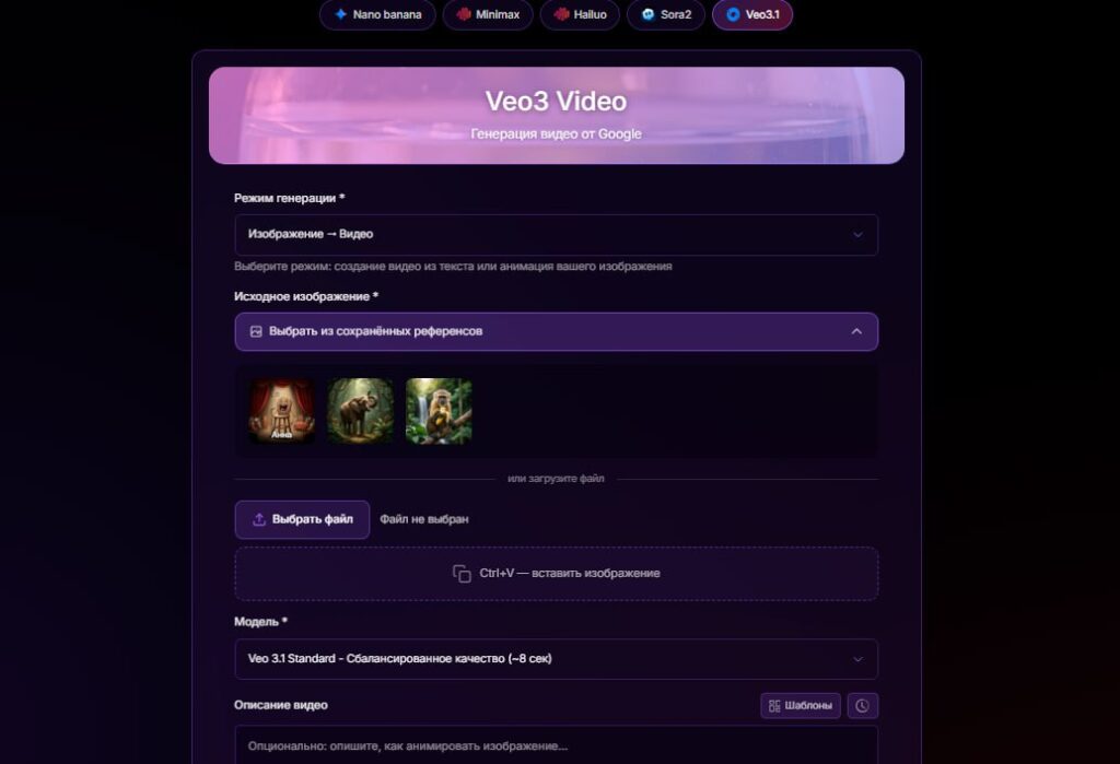 - Модели: Sora 2, Veo 3.1, MiniMax, Kling.