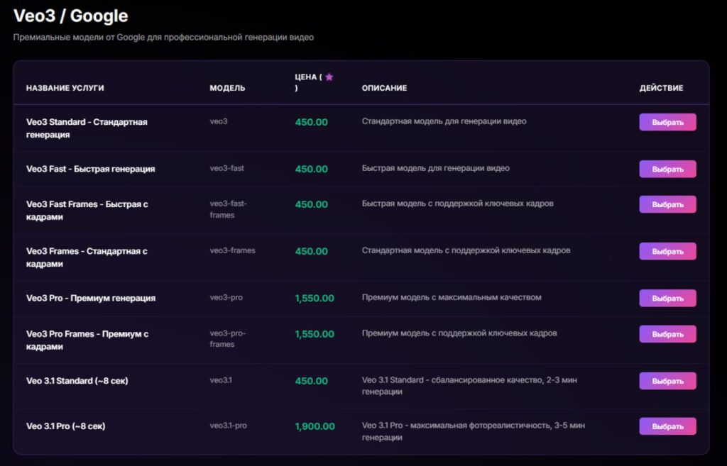 В AiHere нет жестких тарифных планов. Вы платите за действия, а цены зависят от выбранной модели и формата использования. Стоимость операций указана в токенах-«звездочках». Одна «звездочка» — примерно 20 копеек. Стандартная генерация, например, на Veo 3.1 обойдется вам в 450 токенов, премиум-качество — в 1550.