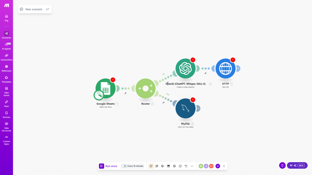И если говорить про нейросеть Make — по сути, это встроенный в платформу искусственный интеллект. Эти ИИ-агенты помогают тебе быстрее и проще строить такие цепочки, подсказывая, как лучше соединить модули или обработать данные.