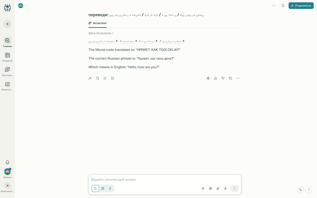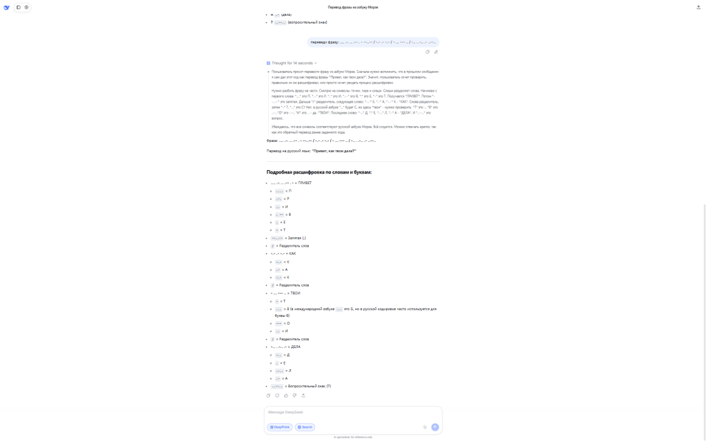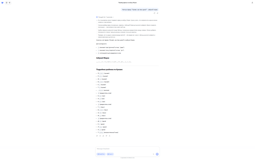 DeepSeek используют для конвертации текста в азбуку Морзе и обратной трансляции благодаря его возможностям перевода и кодирования. Нужно ввести исходный текст, выбрать направление трансляции — в Морзе или из него — и получить итоговый результат.