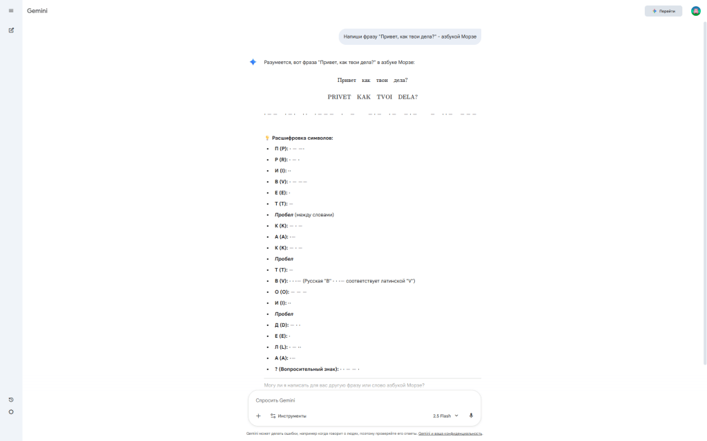 Gemini достаточно легко справляется с переводом на азбуку морзе и расшифровывает каждое слово.