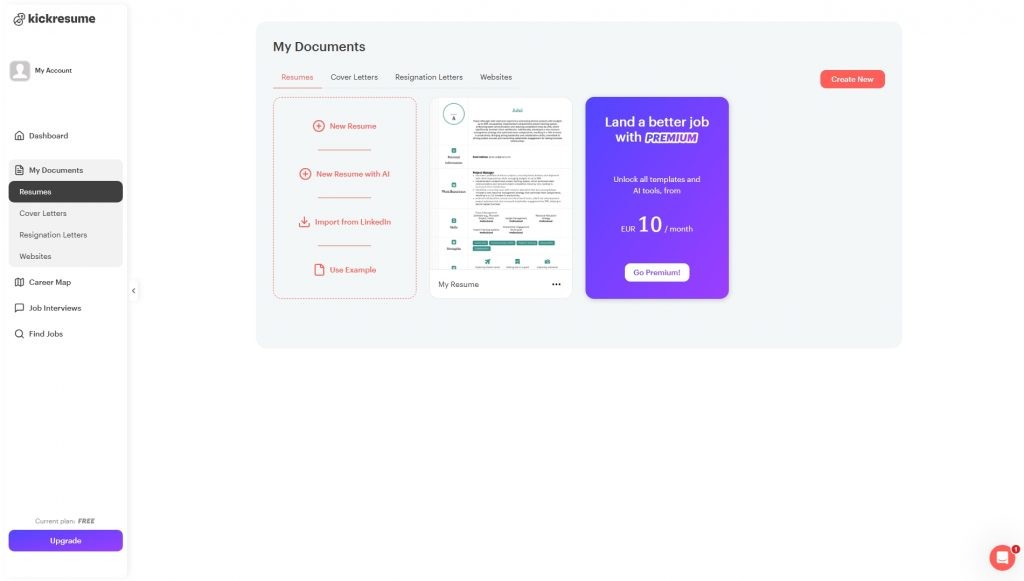 Kickresume – обычный онлайн-конструктор, с ним легко собрать резюме. Тут есть функция ИИ: подкидывает идеи и фразы, если застрял на формулировках, и помогает с шаблонами дизайна. Не нужно часами выбирать оформление — всё уже собрано в один сервис.