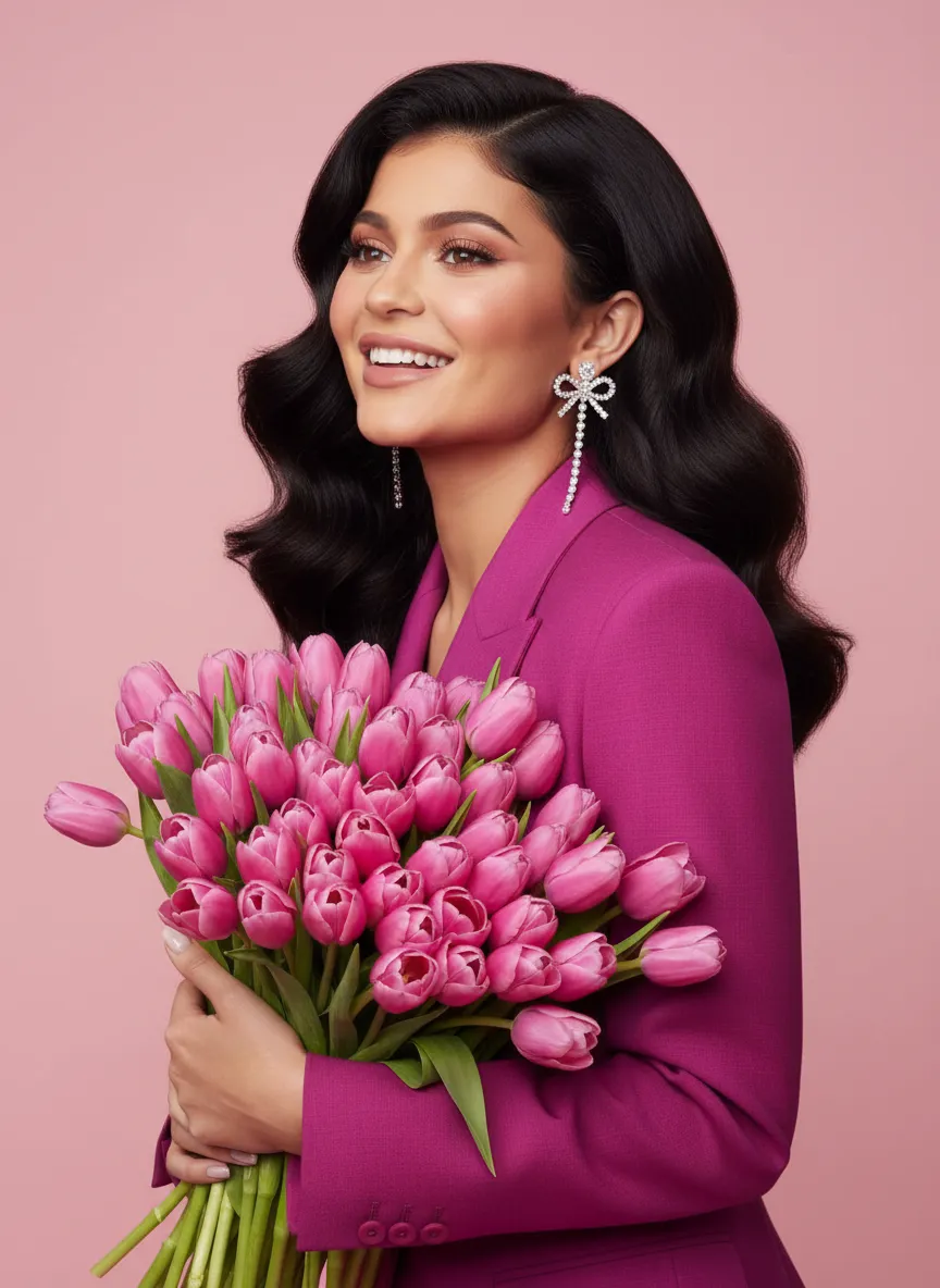 Use the uploaded photo as the absolute sole source for the subject’s appearance. The subject’s face, gender, age, specific facial features, and proportions must remain unaltered, ensuring 100% recognizable likeness. She has voluminous hair styled in soft, elegant waves. She is wearing distinctive long, elegant dangling earrings featuring clear crystals arranged in a decorative bow shape at the lobe with a dropping strand. She is dressed in a vibrant magenta tailored blazer with visible fine fabric texture. The subject is holding a massive, dense bouquet of bright pink tulips with long green stems. There is no wrapping paper; the flowers are loose and kept together only by the firm, natural grip of her hands. She has a wide, joyful smile, looking upwards and slightly to the side. Waist-up portrait, minimalist professional studio with a plain soft pink background. Soft cinematic lighting with gentle highlights on the hair. The camera looks at the girl slightly from the side and from above. High-end photography, sharp focus on eyes and face, shallow depth of field, 85mm lens, 8k resolution, photorealistic, natural skin texture. Aspect Ratio 9:16.