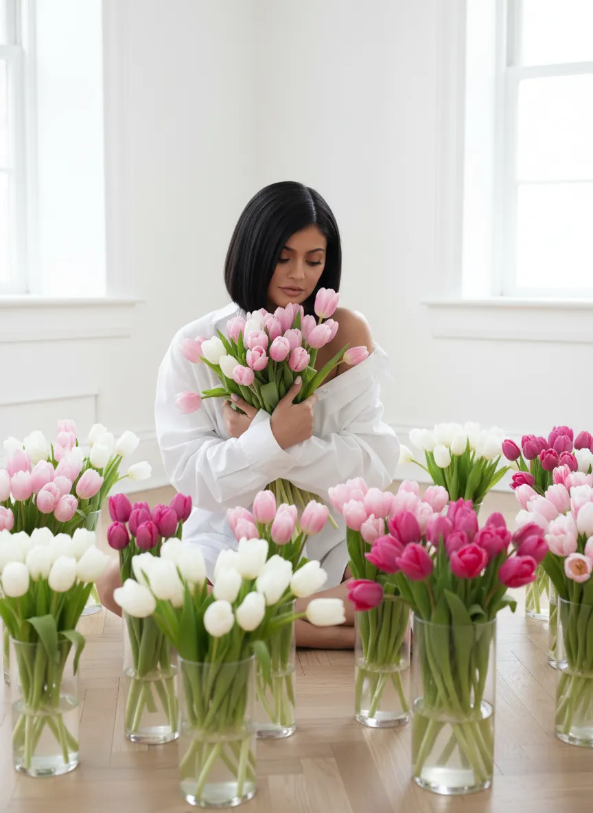 Photorealistic portrait based on the uploaded image, retaining the exact subject appearance. Use the uploaded photo as the only source of appearance. Do not change the face, gender, age, features, and proportions — 100% recognizability. She is sitting on the wooden parquet floor in a bright, white minimalist room. She is wearing an oversized, loose-fitting white button-down shirt, casually styled with one shoulder dropped, revealing her bare shoulder. Her body is angled slightly, and she holds a large, loose bouquet of tulips close to her chest, looking down tenderly at the flowers. The bouquet in her hands is untied, with stems and blooms falling naturally. Numerous transparent cylindrical glass vases filled with tulips are arranged all around her on the floor: positioned on her left and right sides, filling the space behind her, and placed in the foreground in front of her. Crucially, the vases and bouquets in the foreground are positioned so they do not obstruct the view of the girl or her central pose. Each individual vase contains natural tulips of a single, uniform color only: pure white, soft pink, vibrant magenta, or iridescent variegated white-pink. All tulips throughout the scene appear natural, loose, and casually arranged, not stiff or glued together. Soft natural daylight, high detail, 8k resolution.