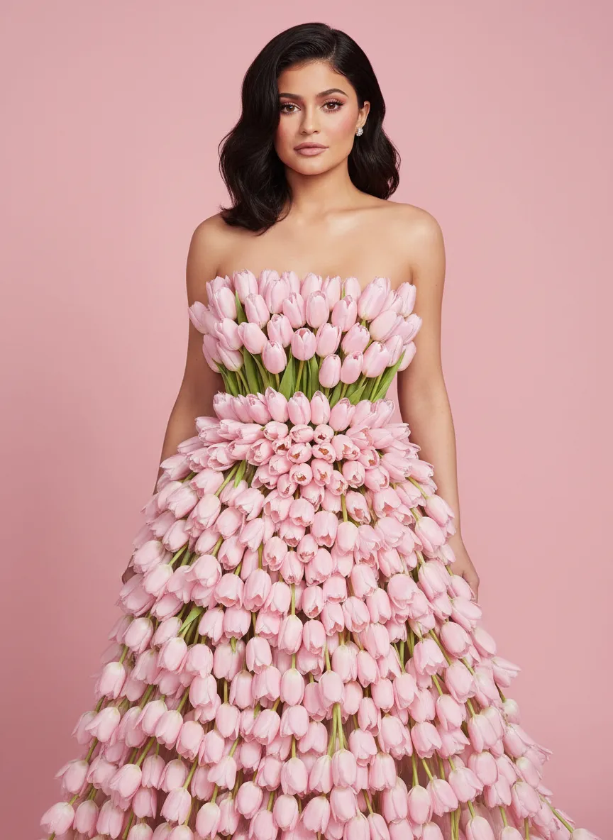 High-end fashion editorial portrait of a woman with a gentle, natural smile, facial features identical to the reference image, exact face resemblance, photorealistic, natural skin texture. The woman is wearing a strapless couture dress entirely made of pink tulips. The tulips are layered densely, forming a soft flowing silhouette with a voluminous, straight skirt. Long green stems create natural structure and volume. Full body shot. Hands are resting naturally at her sides. Fresh spring mood, light and elegant composition. Hair styled softly, clean professional makeup in pastel tones. Light pink studio background. Bright diffused lighting, soft shadows, rich color depth. Luxury fashion photography, glossy magazine quality, ultra-high resolution. Aspect Ratio 9:16.
