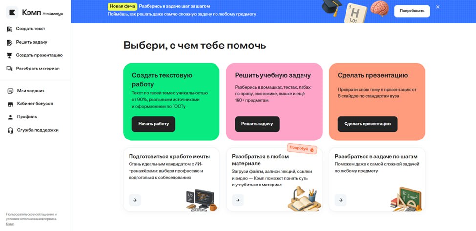 «Кэмп» (бывший Kampus AI) — комплексная платформа, построенная на базе специализированных ИИ-моделей, которые обучались на массиве реальных студенческих работ. Этим «Кэмп» принципиально отличается от универсальных чат-ботов вроде ChatGPT.