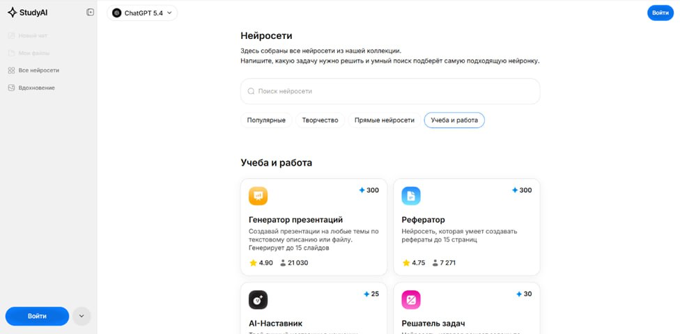 Важный момент: Study24 вообще-то суперагрегатор ИИ-моделей, который предлагает доступ к огромному количеству универсальных и специализированных нейросетей. Но в разделе «Учеба и работа» вы найдете набор сервисов, предназначенных именно для обучения: «Рефератор», «Генератор презентаций», «Решатель задач» и другие.